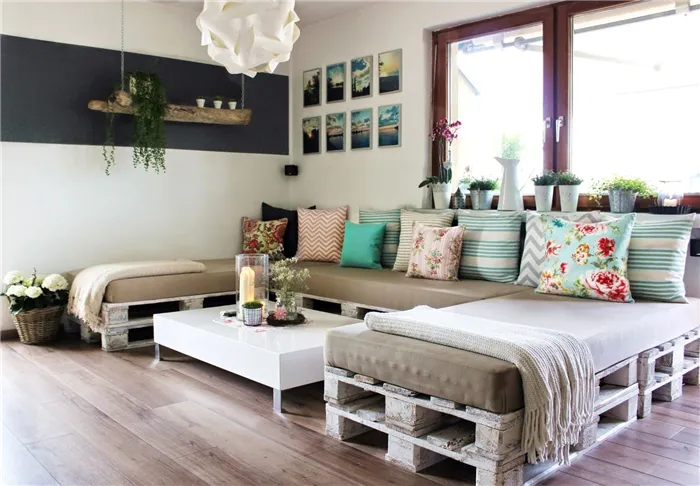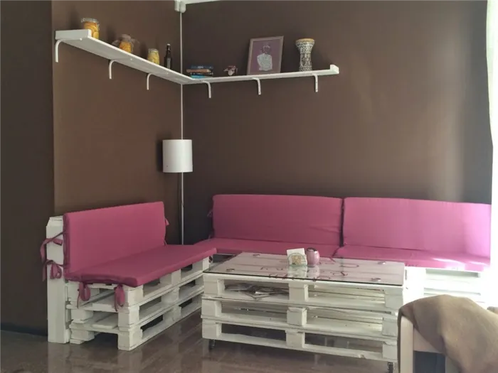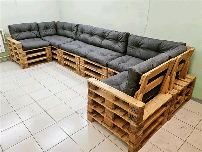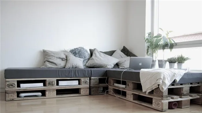 - доступная цена — даже учитывая стоимость фурнитуры и подушек, диван из поддонов, собранный собственноручно, обойдётся значительно дешевле, чем готовые эконом-варианты из магазинов, при этом он будет выглядеть стильно и дорого.