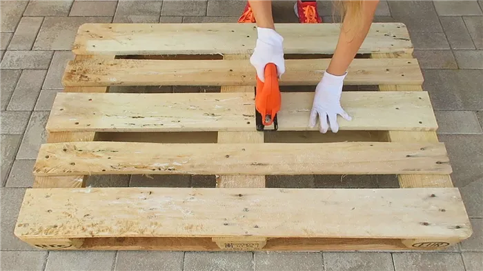 Перед тем как начать изготовление дивана, есть необходимость подготовить поддоны. Сначала их нужно очистить с помощью щетки, а затем тщательно вымыть (можно ручным способом или при помощи садового шланга). После таких действий они не пострадают, даже если ранее подвергались воздействию дождя, мороза и прямых солнечных лучей. Если вы работаете со старыми поддонами, хорошей идеей станет их шлифовка. Для этого отлично подойдут крупная и мелкая наждачная бумага, специальные щётки на дрель или шлифовальная машина. Это позволит не только освежить внешний вид древесины, но и удалить заусенцы. Лучше обработать все детали будущей мебели, хотя это можно делать и только с участками, которые будут контактировать с телом. Если вы хотите разместить диван в саду или на балконе, рекомендуется обработать древесину влагоотталкивающей грунтовкой для защиты от воды, что предохранит материал от плесени и грибка. После завершения всех подготовительных процедур, рекомендуется покрыть паллеты лаком или покрасить.