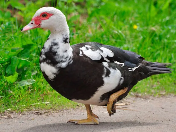 - Черно-белые индоутки: совмещают темный окрас с белыми пятнами на груди, голове и шее. Белые пятна имеют четкие границы. Утки обладают желтыми лапами и красным клювом, а глаза имеют светло-коричневый оттенок.