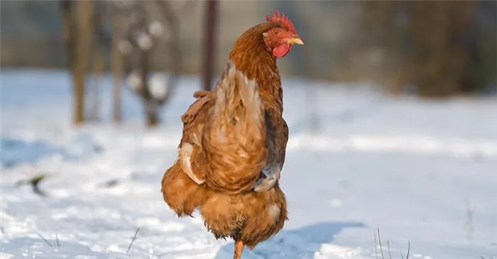 Зимние прогулки для кур тоже необходимы. Их длительность зависит от погодных условий. Хотя куры способны выдерживать морозы до -20 °С, такие низкие температуры считаются критичными, так как могут привести к обморожению гребешков и лап. Поэтому в такой холодный период лучше не выпускать птиц на улицу. Непродолжительные прогулки (1-2 часа) при температуре -10 °С и отсутствии сильного ветра перенесут хорошо. Для комфорта птиц рекомендуется очищать снег на выгоне и посыпать территорию сеном.