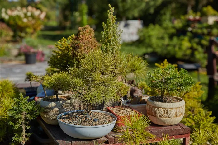 Небольшие кедры в горшках представляют собой бонсай, представляющие собой точные копии настоящих деревьев в миниатюре.