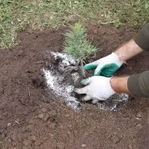 - Затем внесите 2 стакана древесной золы или 1 стакан доломитовой муки, а также любое фосфорно-калийное удобрение. Для увеличения приживаемости и ускорения роста растения в яму рекомендуется добавить корнестимулирующий препарат, например, Корневин. Тщательно перемешайте все ингредиенты, хорошенько полейте посадочную яму и подождите, чтобы слой почвы немного осел.