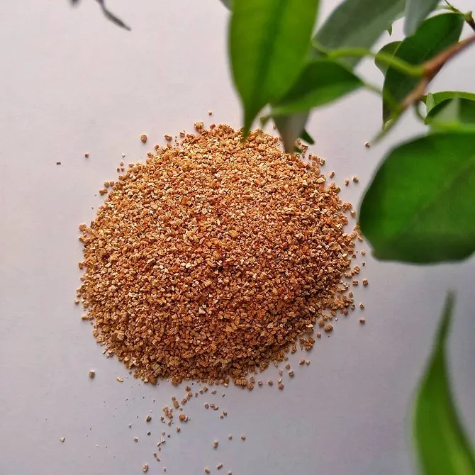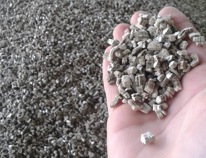 Вермикулит — данный материал представлен крупными пластинчатыми кристаллами, имеющими золотисто-жёлтый или бурый цвет. При нагревании из этих пластинок формируются столбики золотистого или серебристого цвета, которые имеют поперечное деление на тончайшие чешуйки. Обожжённый вермикулит способен плавать на поверхности воды благодаря своей легковесной структуре.