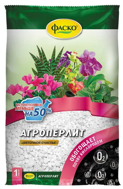 Агроперлит (на фотографии представлена упаковка от компании Фаско) – это природный пористый минерал, содержащий связанное количество воды. В процессе термической обработки в печах при температуре от 1100 до 1550 °C перлит ведет себя аналогично попкорну. Вода в нем меняет свое агрегатное состояние с жидкого на газообразное. Под воздействием нагрева и давления перлит размягчается и расширяется, образуя пенистую структуру, которая после охлаждения затвердевает. Благодаря этому агроперлит может впитывать до 400% воды.