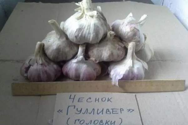Головки крупные, со средней массой 90-120 г. Если чеснок Гулливер растет на плодородной почве и его поливают, то некоторые головки могут достигать даже 250 г. Каждая головка содержит 3-5 очень крупных зубчиков.