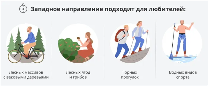Западная часть Подмосковья большей частью покрыта лесами, где располагаются известные заповедники и природные парки, такие как Завидовский, Воронцовский и Теплый Стан. Местные леса изобилуют грибами и ягодами, а также представляют собой дом для различных диких животных. Если вас привлекает отдых у водоёмов, то запад тоже станет идеальным выбором, так как здесь полно рек, озёр и водохранилищ, например, Рузское, Истринское, Озернинское и Можайское водохранилища, которые предлагают отличные условия для купания и рыбалки.