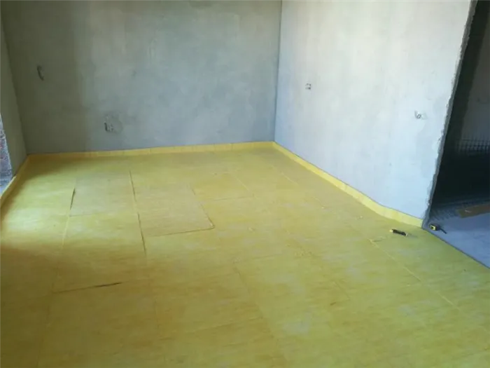 - Слой минваты накрывают пленкой, после чего заливают цемент. Ключевым моментом является то, что цементная стяжка со всех сторон ограничена минватой, что делает ее «плавающей» в данной конструкции.