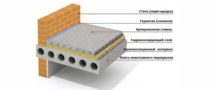 Звукоизоляционные материалы укладывают на заранее подготовленное основание железобетонной плиты, формируя многослойную конструкцию, которая по своей сути напоминает слоеный пирог. На срезе эта конструкция включает следующие слои (снизу вверх):