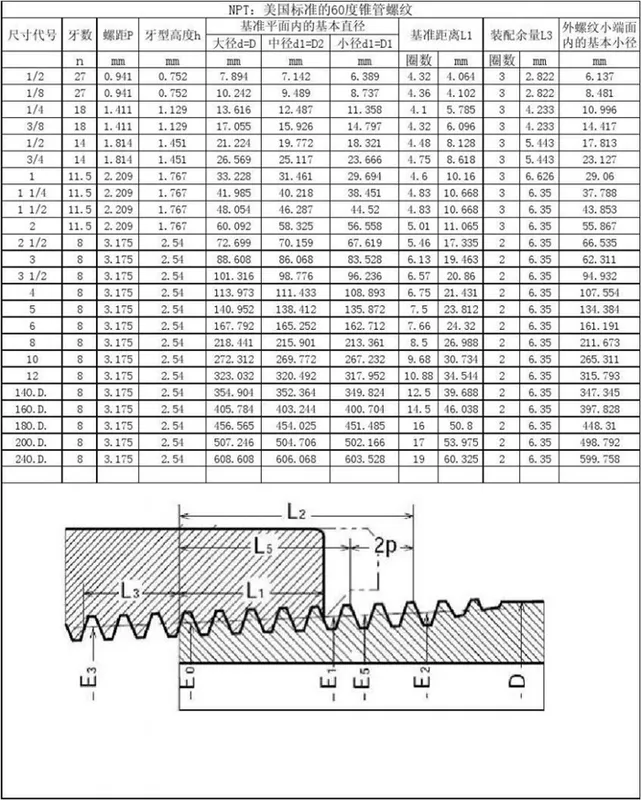 a) NPT, сокращение от American National Pipe Thread, относится к американскому стандарту, используемому для конической трубной резьбы с угол наклона 60 градусов. В настоящее время этот стандарт применяется в Северной Америке. Соответствующий стандарт можно сопоставить с GB / T12716-1991: W.