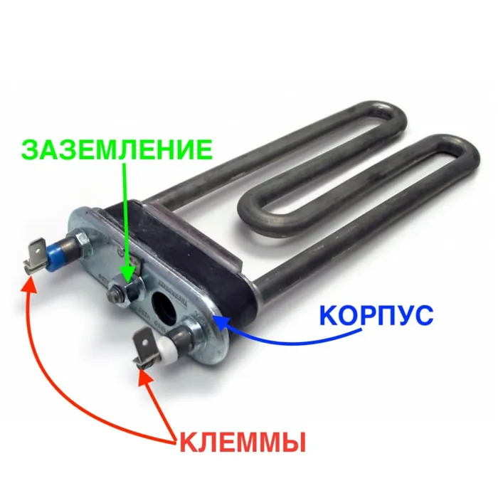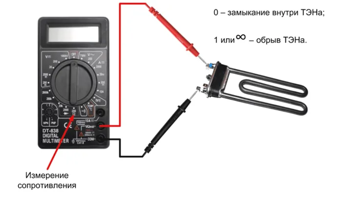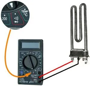 Важно! Нет необходимости извлекать ТЭН из стиральной машины для проверки мультиметром; достаточно снять провода с клемм.