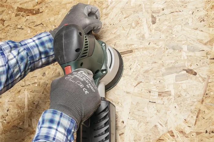 - Отшлифуйте поверхность ОСБ-плиты, предпочтительно используя шлифмашинку с насадками средней зернистости, так как они оптимально подходят для этого материала.