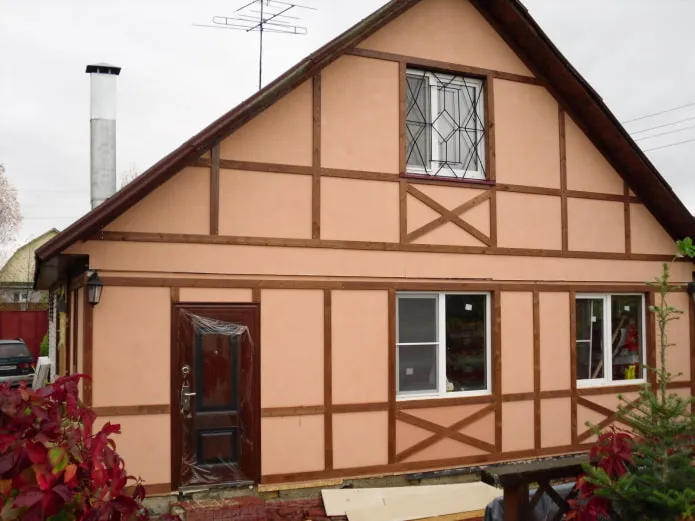 Совет: чтобы фасад выглядел аккуратно и стильно, закройте швы декоративными раскладками из досок размером 25х100 мм. Их расположение будет зависеть от размеров плит, поэтому перед облицовкой следует произвести расчёт не только количества материалов, но и размещение листов. Темные доски на фоне светлой краски, закрывающие стыки, будут имитировать фахверковый брус.