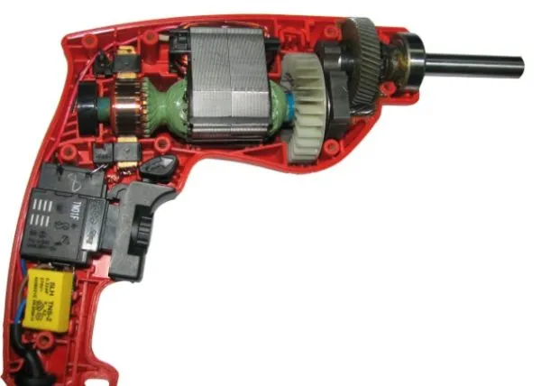 Корпус электроинструмента чаще всего изготовлен из пластика, реже — из металлических сплавов. Обычно корпус состоит из двух половинок для удобства сборки. Внутри корпуса находятся ключевые детали: