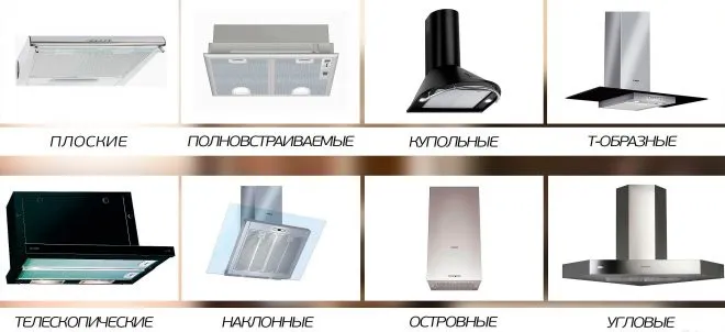 По особенностям конструкции корпуса выделяются несколько типов вытяжек: