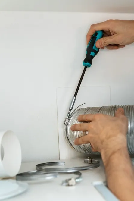 После закрепления вытяжки на стене, к ней подключается труба для воздуховода. Если используется не алюминиевая гофротруба, а пластиковая, рекомендуется заранее приобрести герметик, переходники и повороты.