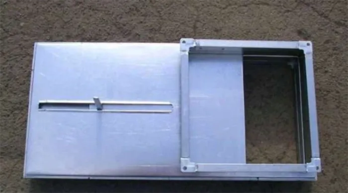 - Выдвижной. Это шибер, выполненный в виде стальной пластины, которая по мере необходимости перемещается по канавкам воздуховода, позволяя перекрыть воздушные потоки полностью.
