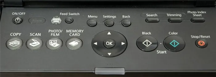 - На панели управления найдите следующие 4 кнопки: 1) кнопка питания «ON/OFF» или «Power»; 2) кнопка активации черно-белого режима печати (обозначена ромбом с полосой внутри); 3) кнопка «ОК»; 4) кнопка «Стоп/Сброс».