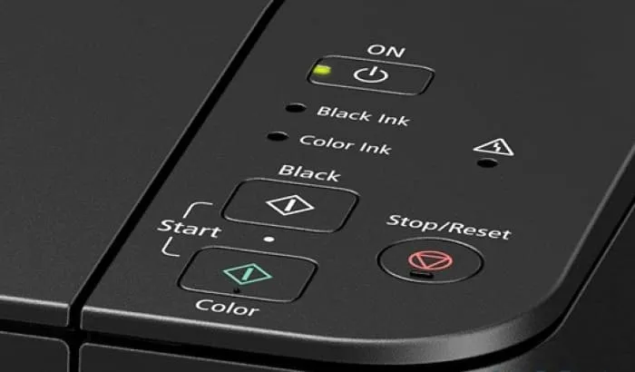 - Когда на экране принтера появится сообщение об уровне чернил, нажмите на кнопку «Стоп/Сброс» (обычно она обозначена треугольником внутри круга) и удерживайте её на протяжении минимум 5 секунд. В ряде моделей принтеров для этого может понадобиться удерживать кнопку дольше, обычно, не больше 30 секунд.